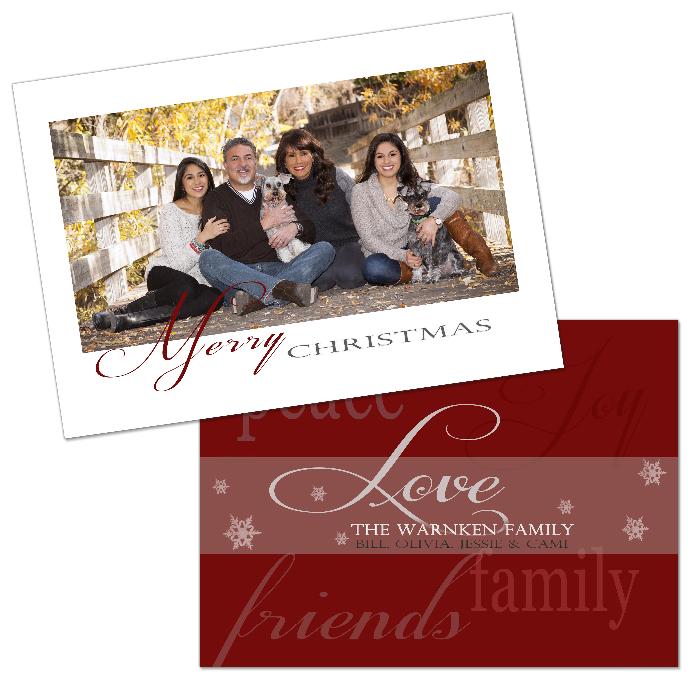 Description:   This is a sample holiday card--designs are available in a 4x8 or 5x7 size and come in a flat, folded, or tri-fold style, either in a vertical or horizontal orientation. All cards are customized to reflect your desired layout, colors, text, fonts, graphics, etc. For example, the background color of the card may be matched specifically to that of your clothing in the photo.
