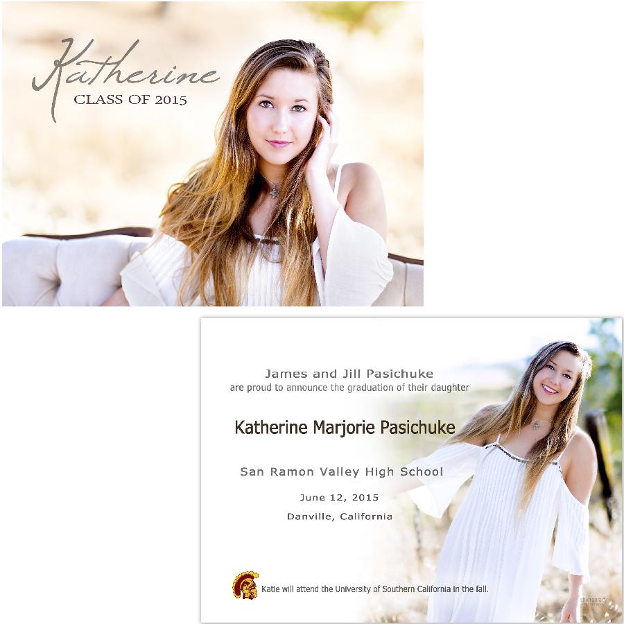 Description:   This is a sample graduation announcement--designs are available in a 4x8, 5x7, or 5x5 size and come in a flat, folded, or tri-fold style, either in a vertical or horizontal orientation. All thank you cards come in a folded 4x5.5 size. Tri-fold cards are priced as a 5x5 card. Other sizes available upon request. All cards are customized to reflect your desired layout, colors, text, fonts, graphics, etc. For example, the background color of the card may be matched specifically to your high school or college colors or your clothing in the photo. University logos are a popular customization to include as well.