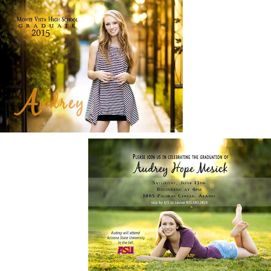 Description:   This is a sample graduation announcement--designs are available in a 4x8, 5x7, or 5x5 size and come in a flat, folded, or tri-fold style, either in a vertical or horizontal orientation. All thank you cards come in a folded 4x5.5 size. Tri-fold cards are priced as a 5x5 card. Other sizes available upon request. All cards are customized to reflect your desired layout, colors, text, fonts, graphics, etc. For example, the background color of the card may be matched specifically to your high school or college colors or your clothing in the photo. University logos are a popular customization to include as well.