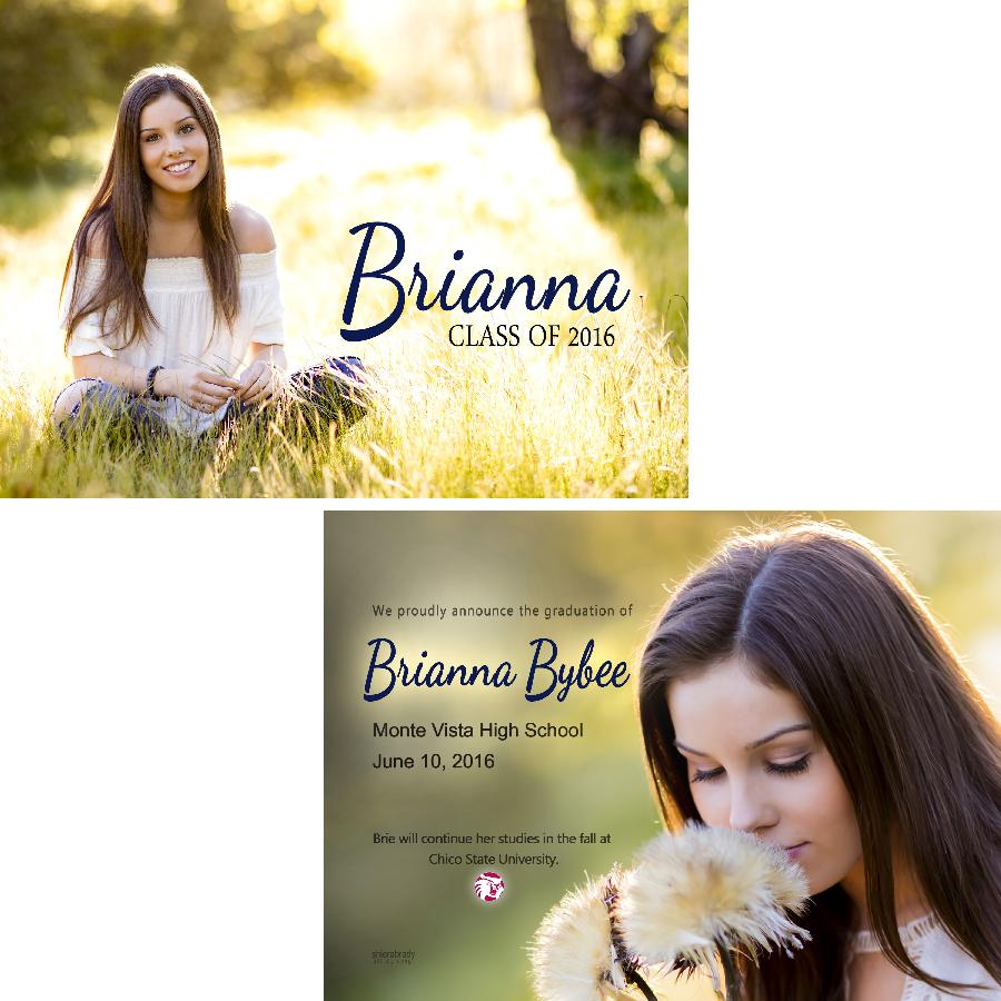Description:   This is a sample graduation announcement--designs are available in a 4x8, 5x7, or 5x5 size and come in a flat, folded, or tri-fold style, either in a vertical or horizontal orientation. All thank you cards come in a folded 4x5.5 size. Tri-fold cards are priced as a 5x5 card. Other sizes available upon request. All cards are customized to reflect your desired layout, colors, text, fonts, graphics, etc. For example, the background color of the card may be matched specifically to your high school or college colors or your clothing in the photo. University logos are a popular customization to include as well.