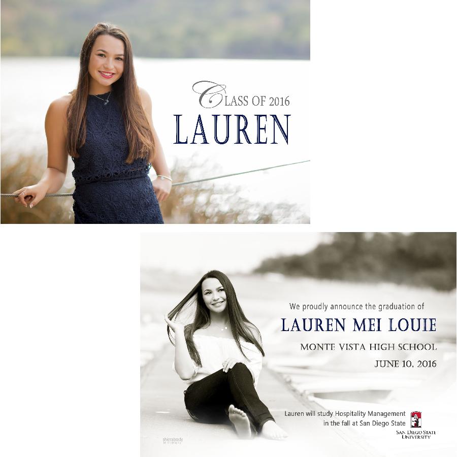 Description:   This is a sample graduation announcement--designs are available in a 4x8, 5x7, or 5x5 size and come in a flat, folded, or tri-fold style, either in a vertical or horizontal orientation. All thank you cards come in a folded 4x5.5 size. Tri-fold cards are priced as a 5x5 card. Other sizes available upon request. All cards are customized to reflect your desired layout, colors, text, fonts, graphics, etc. For example, the background color of the card may be matched specifically to your high school or college colors or your clothing in the photo. University logos are a popular customization to include as well.