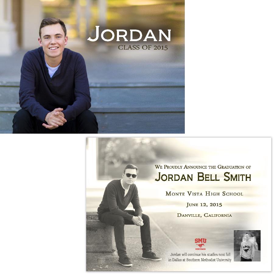 Description:   This is a sample graduation announcement--designs are available in a 4x8, 5x7, or 5x5 size and come in a flat, folded, or tri-fold style, either in a vertical or horizontal orientation. All thank you cards come in a folded 4x5.5 size. Tri-fold cards are priced as a 5x5 card. Other sizes available upon request. All cards are customized to reflect your desired layout, colors, text, fonts, graphics, etc. For example, the background color of the card may be matched specifically to your high school or college colors or your clothing in the photo. University logos are a popular customization to include as well.