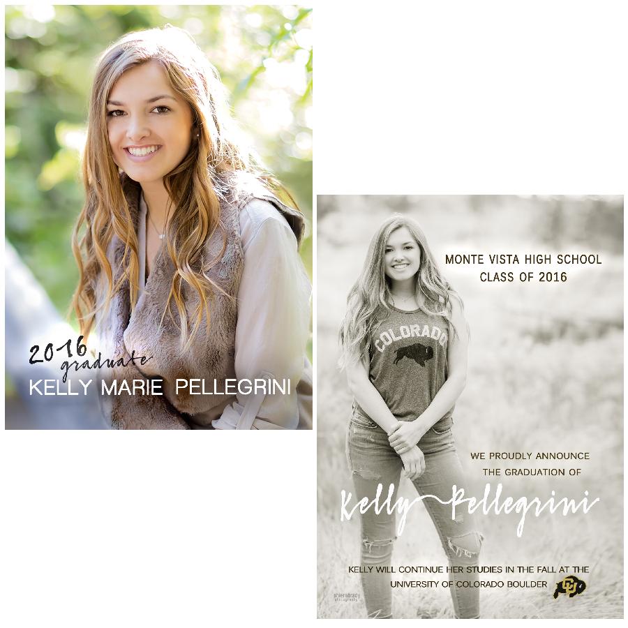 Description:   This is a sample graduation announcement--designs are available in a 4x8, 5x7, or 5x5 size and come in a flat, folded, or tri-fold style, either in a vertical or horizontal orientation. All thank you cards come in a folded 4x5.5 size. Tri-fold cards are priced as a 5x5 card. Other sizes available upon request. All cards are customized to reflect your desired layout, colors, text, fonts, graphics, etc. For example, the background color of the card may be matched specifically to your high school or college colors or your clothing in the photo. University logos are a popular customization to include as well.