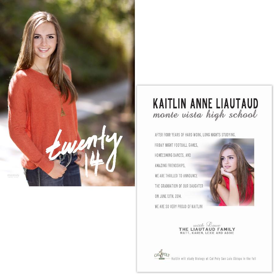 Description:   This is a sample graduation announcement--designs are available in a 4x8, 5x7, or 5x5 size and come in a flat, folded, or tri-fold style, either in a vertical or horizontal orientation. All thank you cards come in a folded 4x5.5 size. Tri-fold cards are priced as a 5x5 card. Other sizes available upon request. All cards are customized to reflect your desired layout, colors, text, fonts, graphics, etc. For example, the background color of the card may be matched specifically to your high school or college colors or your clothing in the photo. University logos are a popular customization to include as well.