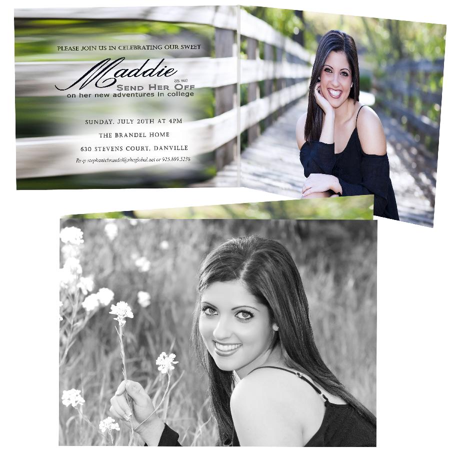 Graduation announcement designs are available in a 4x8, 5x7, or 5x5 size and come in a flat, folded, or tri-fold style, either in a vertical or horizontal orientation. All thank you cards come in a folded 4x5.5 size. Tri-fold cards are priced as a 5x5 card. Other sizes available upon request. This particular sample is a wide format folded card announcement--it is a folded card that opens horizontally right to left like a book. There are four panels to display photos and/or text.